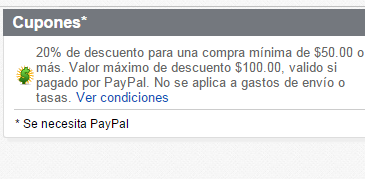 Hola buen día a todos, desde hace tiempo que conozco el foro y asi pero hasta ahorita me a surgido un problema. Resulta que hace varios dias, en mi cuenta de ebay me apareció que tenía un cupon por el 20% de descuento en todas las compras por paypal mayores a $50.00 dlls,